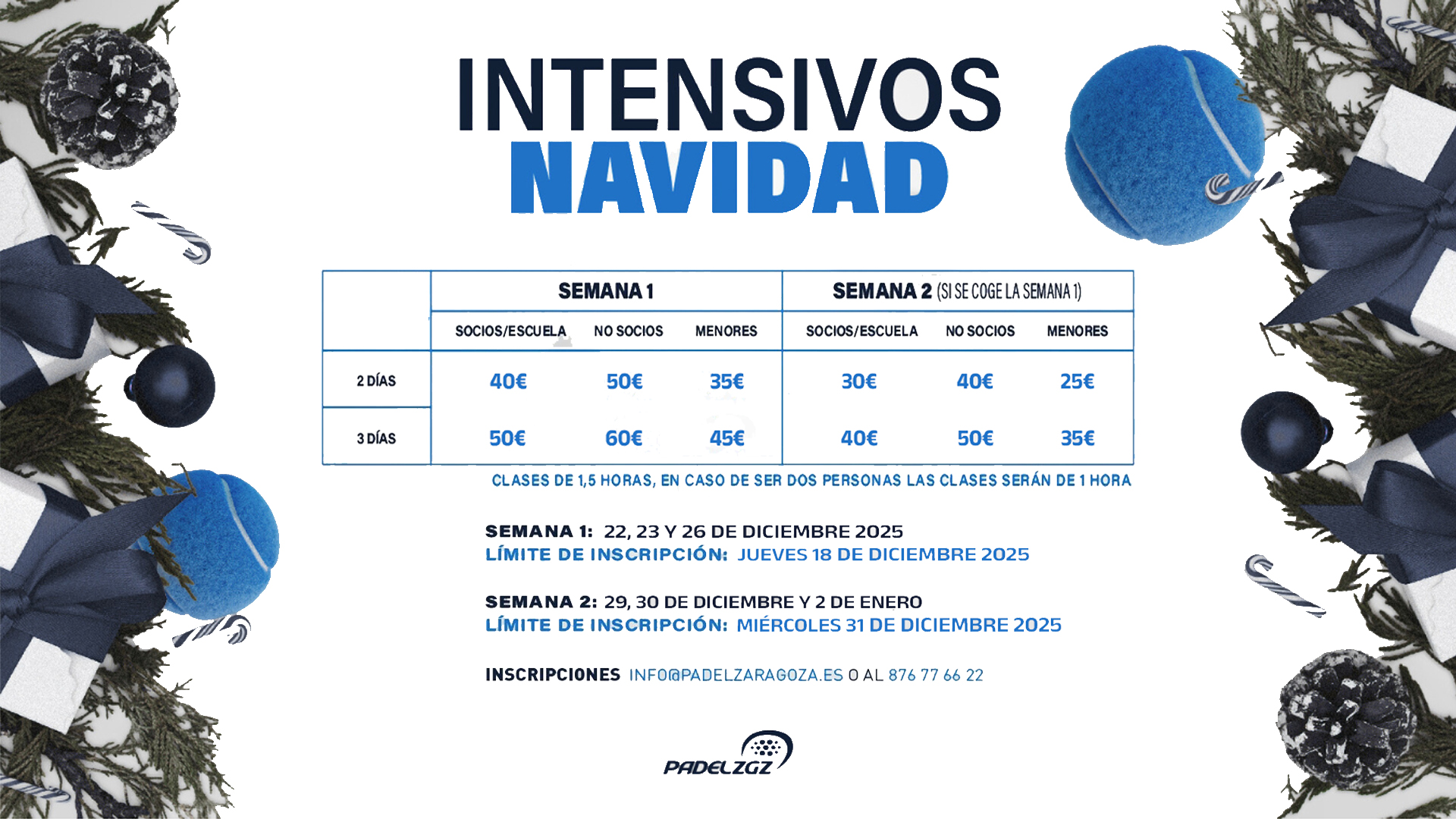Llega la Navidad y con ella los cursos intensivos a Padel Zaragoza. Del 22 de Diciembre al 2 de Enero ofertamos cursos semanales con 2 y 3 clases de 90 minutos a la semana.